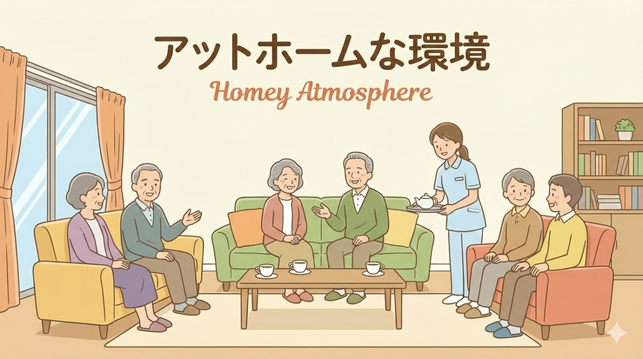 たいへん便利でとても静かな環境の中、入居者の皆さんは、自由にのびのびとすごされています。